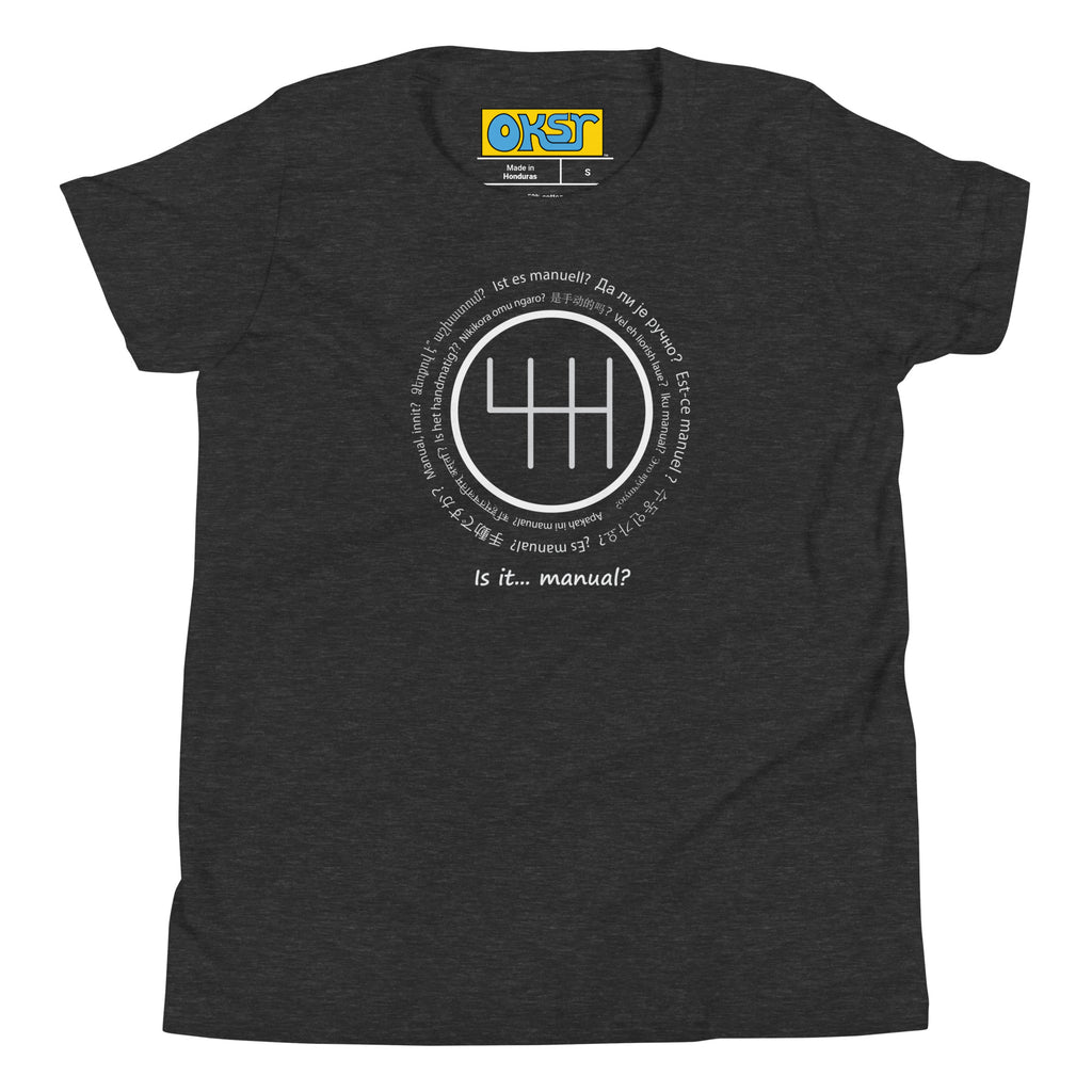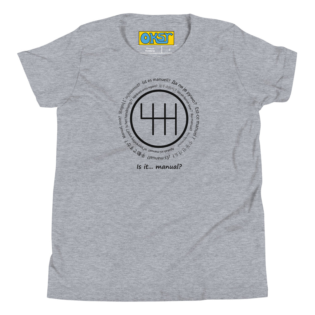 It's the question that strikes fear and shame in the hearts of automatic transmission owners. A dreaded confession. The pride of the stick-shift tribe. It's the first question every car guy or auto gal asks about your ride, if they're going to ask at all. Whether a source of shame or pride, defuse the tension with our Is It Manual? tee.